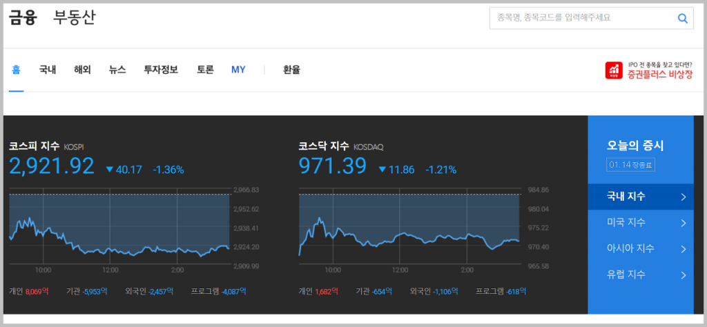 경제 공부를 위한 다양한 사이트가 있지만, 저는 다음 금융의 증권 시세를 주로 이용하고 있습니다. 이 사이트를 선택한 이유는 굉장히 깔끔한 인터페이스 때문입니다.