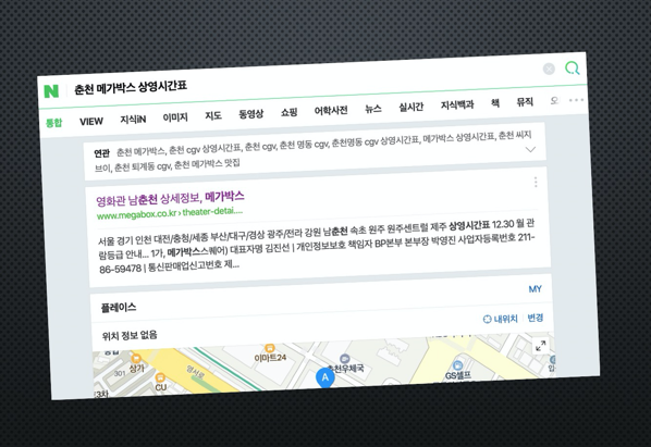 이제는 핸드폰으로 검색만 해도 영화 상영정보를 바로 찾아볼 수 있습니다. 하지만 주의할 점은 정확한 위치 이름을 입력해야 원하는 내용을 찾을 수 있다는 점 입니다. 특히 Megabox의 경우에는 이름이 조금 다른 경우도 있으므로 주의가 필요합니다. 예를 들어 춘천에는 '춘천 메가박스'가 아니라 '남춘천 메가박스'가 있는데, 정확한 상호명을 입력하지 않으면 시간표가 나오지 않습니다.