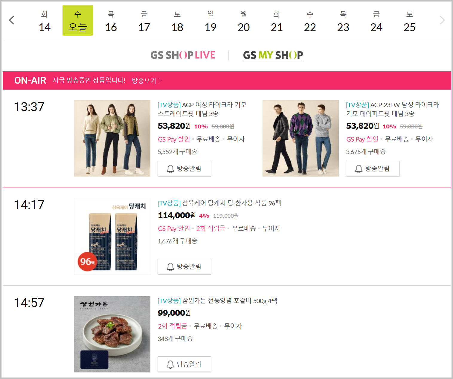 상단에 있는 TV편성표로 들어가시면 어떤 제품을 판매할 예정인지 어렵지 않게 파악할수 있습니다. 두 채널 구분되어서 나오기 때문에 모두 확인해보면 좋습니다. 저도 사고 싶은 것들이 보이네요. 기본 셋팅은 '오늘'이지만 날짜를 변경할수 있고, 과거에 무엇을 했는지 볼수 있습니다. 그리고 클릭을 하면 구매가 가능하도록 홈페이지가 만들어 졌네요.