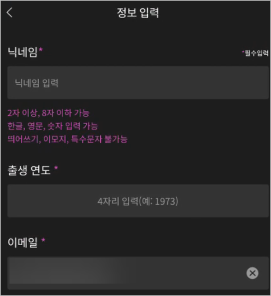 가입 시 제공해야 할 정보는 다음과 같습니다. 닉네임, 출생년도, 이메일, 성별은 필수 입력 사항이며, 가장 중요한 정보는 휴대폰 번호입니다. 휴대폰 번호를 입력하지 않으면 추첨 대상에서 제외되므로, 반드시 입력해야 합니다. 이는 기본적인 추첨 기준으로 활용되기 때문에 정확히 기재하는 것이 중요합니다.