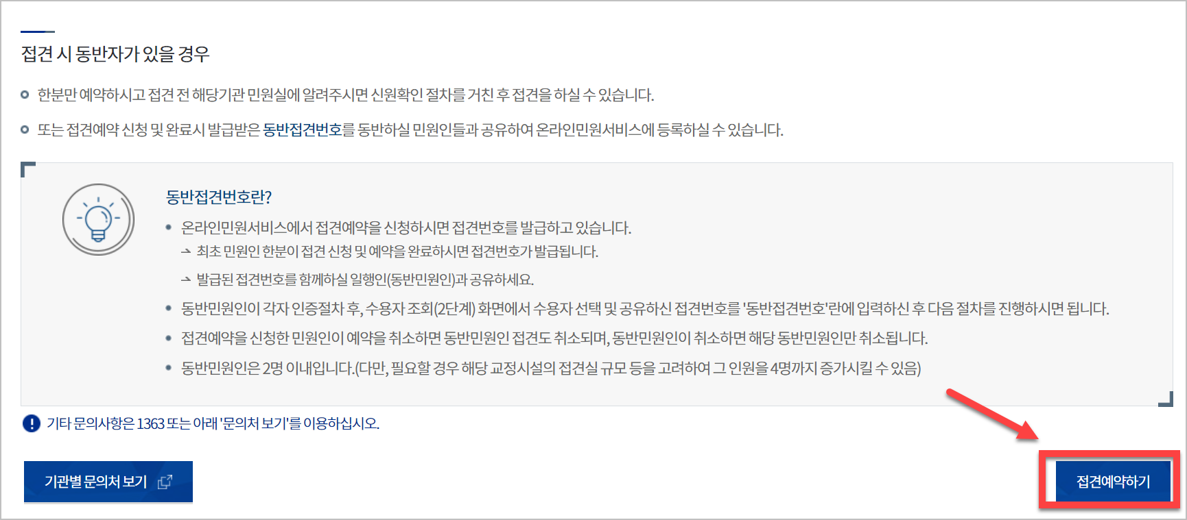 - 동반: 동반 접견을 원할 경우, 동반접견번호를 발급받아 함께 접견할 수 있으며 최대 4명까지 동반 가능합니다.