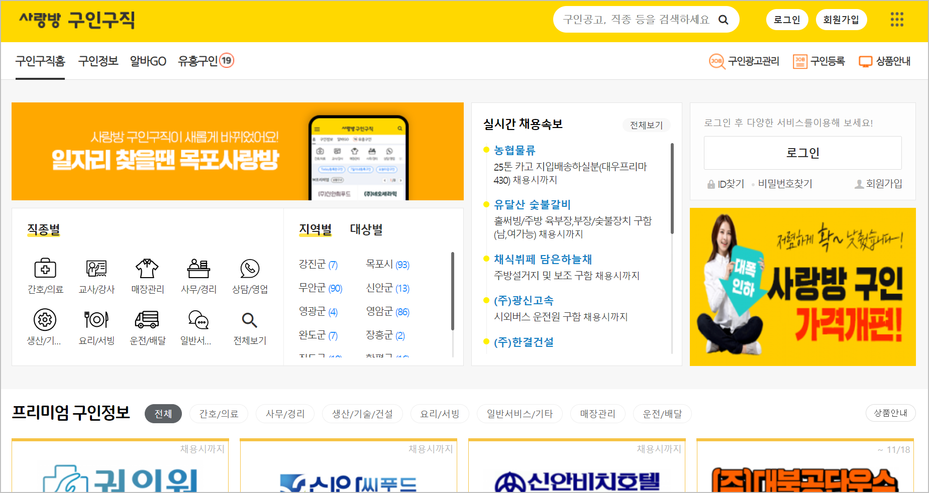 이 섹션에서는 다양한 일자리를 찾아볼 수 있습니다. 직종별, 지역별로 세분화된 검색이 가능해 원하는 내용을 쉽게 찾을 수 있습니다. 간호/의료, 교사/강사, 매장관리, 사무/경리, 상담/영업, 생산/기술/건설, 요리/서빙, 운전/배달 등 다양한 직종의 일자리광고가 제공됩니다.