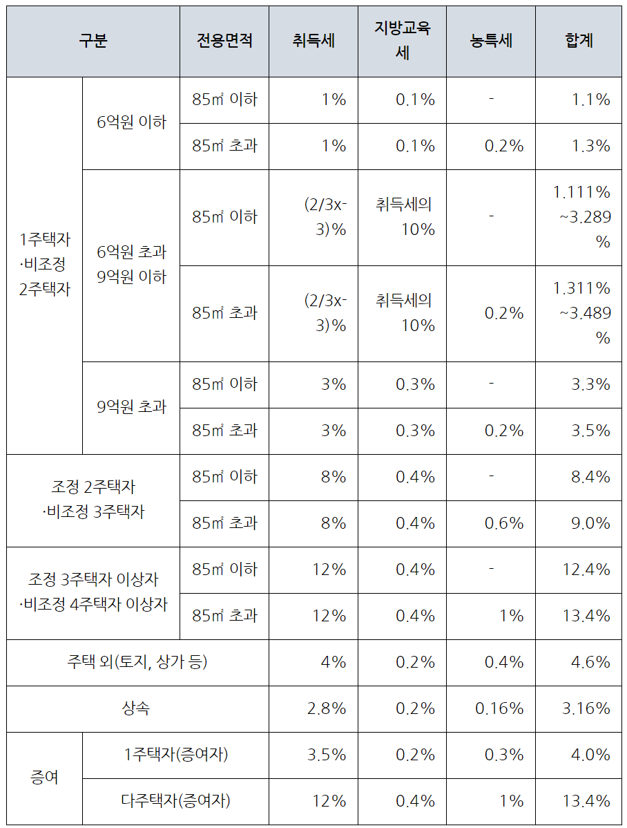 법에서 정한것을 정리를 하면 위의 표로 정리를 할수 있습니다. 하지만 생각보다 복잡해서 모든 경우를 다 포함할수는 없습니다. 여러가지 예외 조항들이 있기 때문입니다. 대략적인 참고용으로만 생각하시면 좋을것 같아요. 조금더 정밀한 것을 원한다면 아파트 등록세 계산기 같은것을 활용하시면 됩니다.
