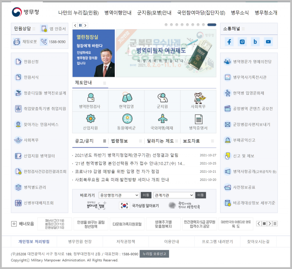 대신에 병무청 누리집을 자주 이용하게 됩니다. 이곳은 군 복무와 관련된 다양한 정보를 제공하기 때문입니다. 병역판정검사, 군지원 모병안내 등 군대와 관련된 전반적인 내용을 알 수 있습니다. 네이버나 다음과 같은 주요 포털 사이트에서 검색을 하면 해당 누리집에 접속할 수 있습니다.