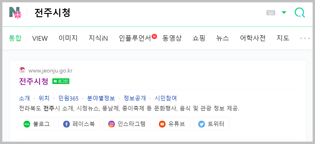 전주시청 홈페이지를 들어가기 위해서는 네이버 홈페이지를 경유해서 들어가는 것이 가장 편리한 방법입니다. 위 화면을 보시면 네이버에서 전주시청을 검색한 모습입니다. 첫번째 검색결과를 선택하시면 해당 사이트를 들어갈 수 있습니다.