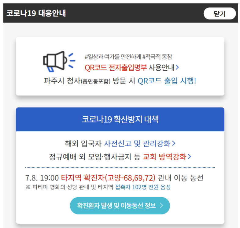 파주시청 홈페이지에 들어가면 현재 방역상황, 그리고 방역정책에 대해서 확인이 가능합니다. 현재는 해외입국자와 교회방역강화에 대해서 설명을 하고 있습니다. 또한 타지역 확진자의 관내 이동동선을 확이할 수 있습니다.