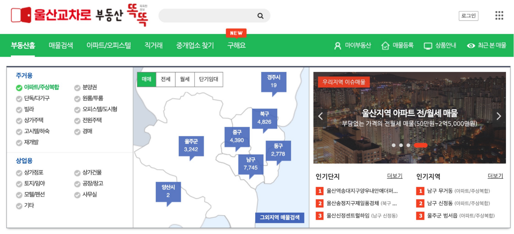 들어가 보시면 경주, 울주, 양산의 정보를 포함한 울산 부동산 정보가 올라와 있습니다. 이 정보는 교차로 신문에 올라와 있는 정보가 포함이 되어 있습니다. 지도로도 체크가 가능할 뿐만 아니라 줄광고 형식으로도 체크가 가능합니다.