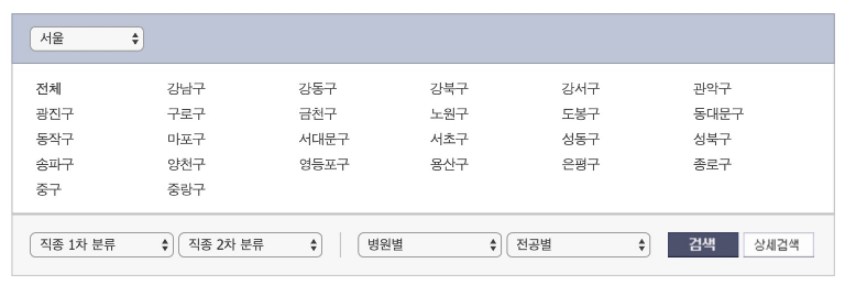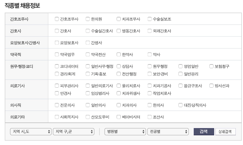 간호잡의 장점이라고 한다면 지역별로 세분화되어 구분이 되어 있는게 아닐까 싶습니다. 서울, 경기, 인천, 부산과 같이 큼직하게 나눠져 있습니다.