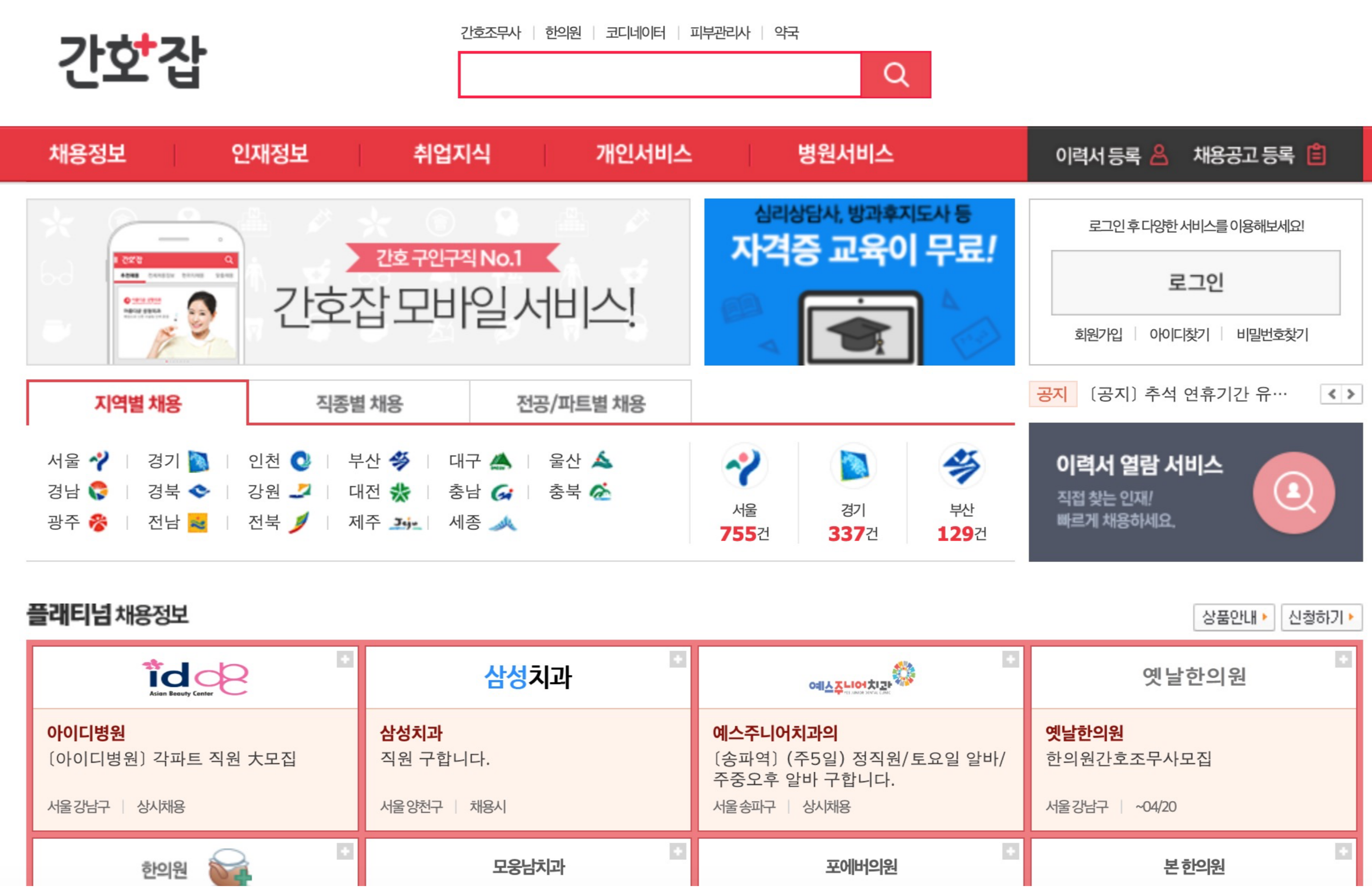 간호잡은 유명한 알바천국의 패밀리 사이트입니다. 알바천국과 같은 회사라고 봐도 될것 같아요. 그래서 그런지 꽤나 깔끔하고 사용성이 높게 만들어졌습니다.
