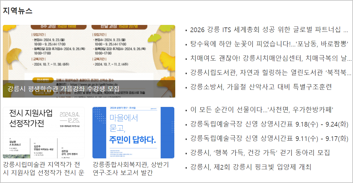 지역 소식 섹션에서는 강릉의 최신 뉴스와 이벤트 정보를 얻을 수 있어, 지역 사회와의 연결성을 높이는 데 기여하고 있죠.