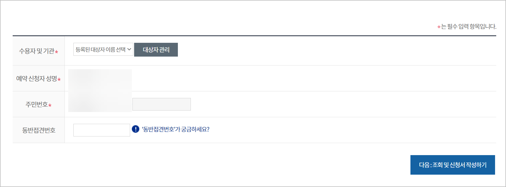 이후에 수용자 및 기관, 신청자 성명, 주민번호 등 여러가지 정보를 입력하고 다음을 클릭합니다. 이후에 조회및 신청서를 작성하면 완료를 할수 있습니다.