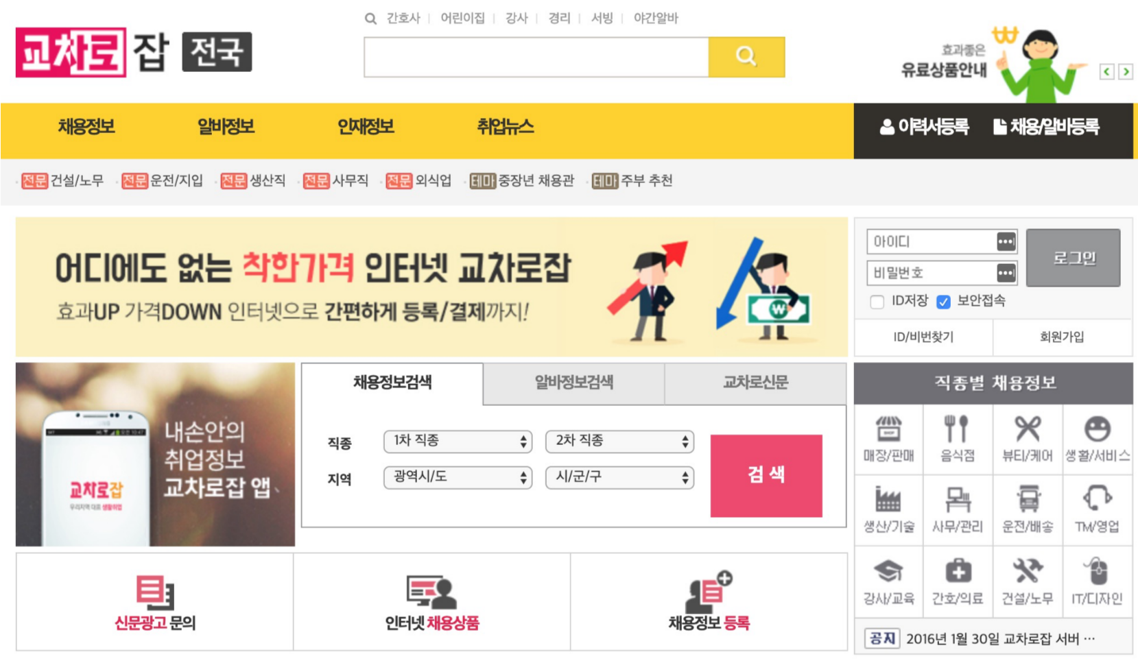 하지만 현재는 교차로잡 사이트가 폐쇄가 되었습니다. 개편으로 인하여 교차로잡이 더이상 운영을 하지 않고 개별 교차로신문에 종속이 된 상태입니다. 전국의 구인구직 정보가 하나로 통합되지 않고 지역에서 관리하는 방식으로 보여집니다.