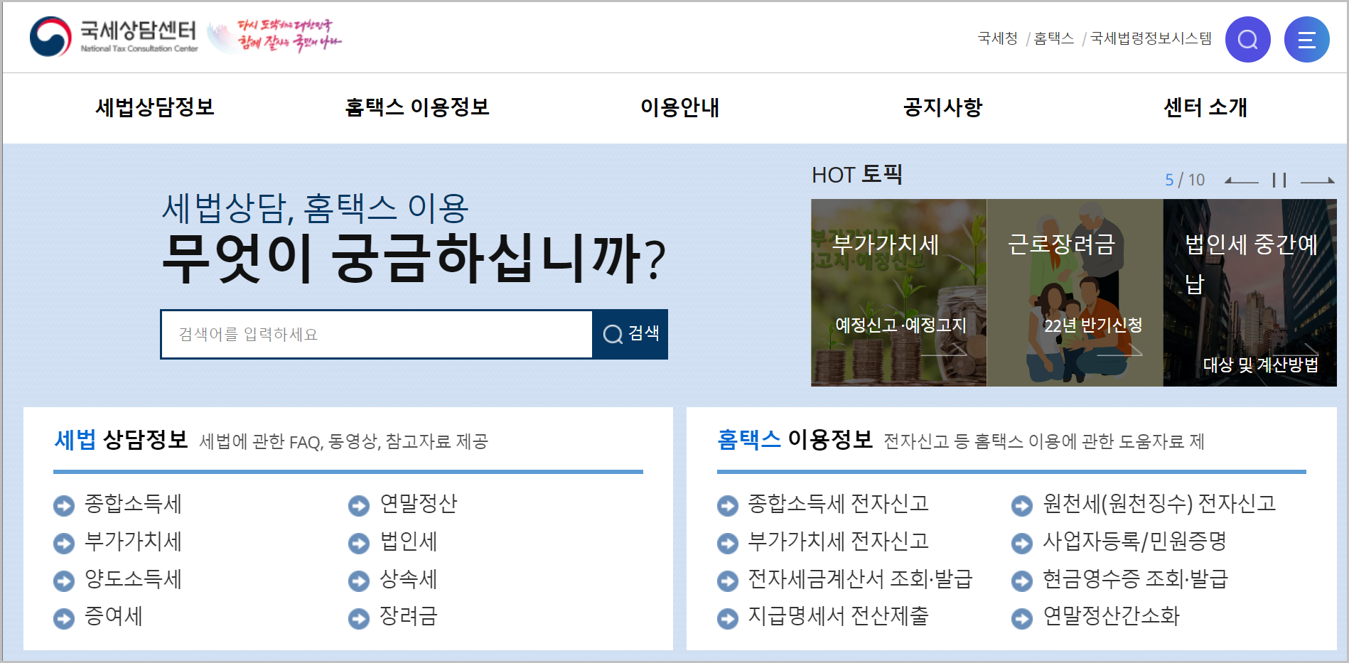 홈페이지에서도 문의를 할수 있습니다.위 링크로 들어가시면 국세상담센터로 들어가실 수 있습니다. 이곳에서 인터넷 상담을 할수 있을 뿐만아니라 홈택스 이용시 자주 묻는 질문에 대하여 배울수 있습니다. 또한 관련된 다양한 현재 이슈들을 다루고 있습니다.