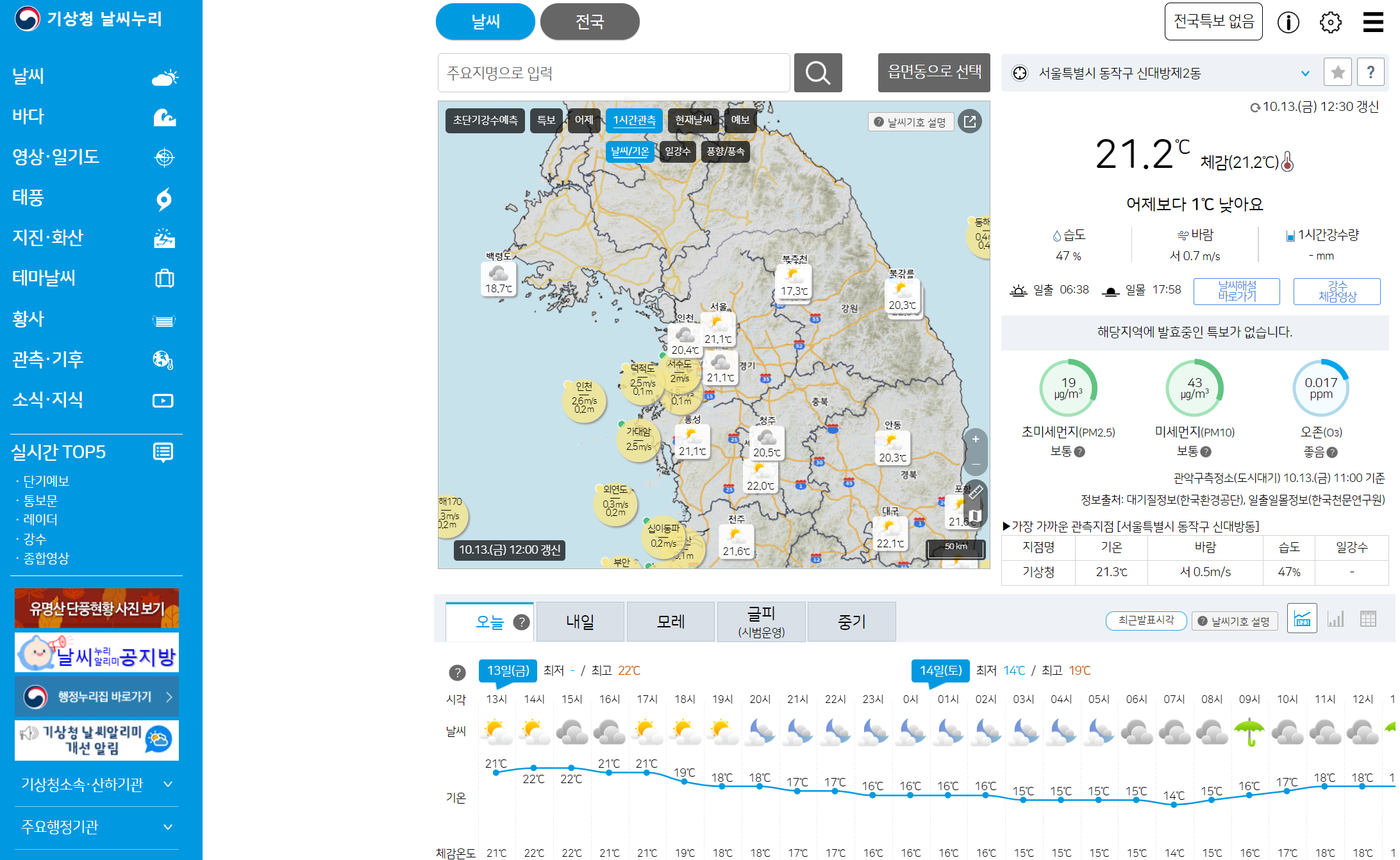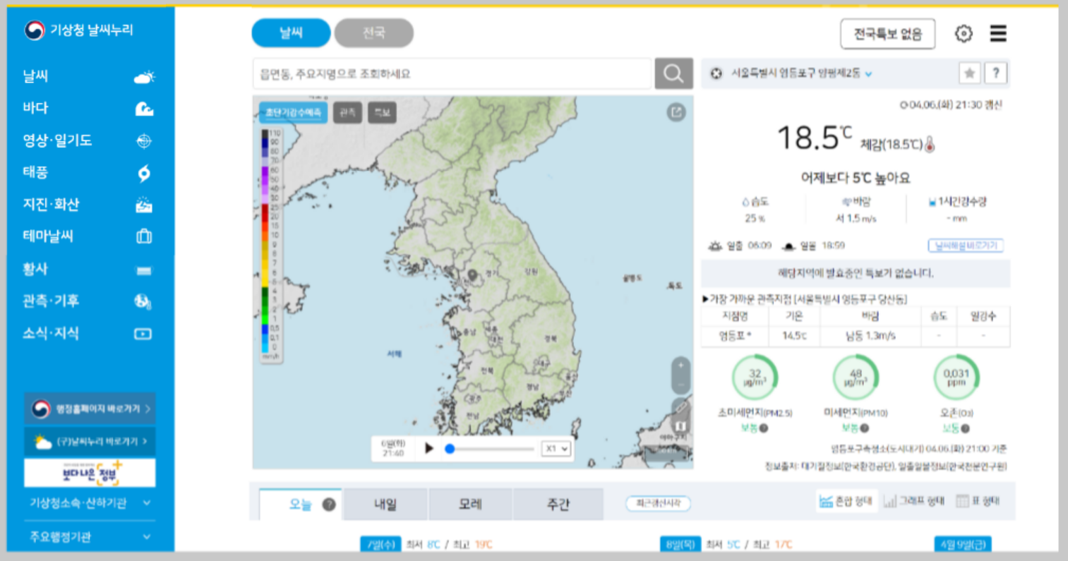 여기로 들어가시면 기상청에서 제공하고 있는 다양한 서비스를 한번에 볼수 있는 날시누리 사이트로 들어가실 수 있습니다. 네이버 다음에서 '날씨누리'라고 검색을 하시면 어렵지 않게 방문이 가능합니다.