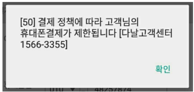 다날 결제정책 오류 50 : 이 메시지는 상당히 많이 보이는 오류입니다. 이 메시지는 기본적으로 주어지는 소액결제 한도가 있습니다. 근데 한도와는 상관없이 사용할 수 없는 곳이 있습니다. 보통은 상품권을 구매할 때 이러한 메시지를 보게 됩니다.