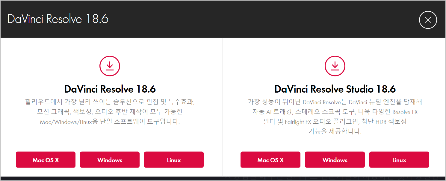 왼쪽은 일반버전이고, 우측은 유료로 구매해야 사용할수있는 스튜디오 버전입니다. 그리고 하단에 보면 맥, 윈도우 그리고 리눅스까지 이용가능하다고 되어 있네요. 자신의 OS에 맞는것을 선택하시면 됩니다.