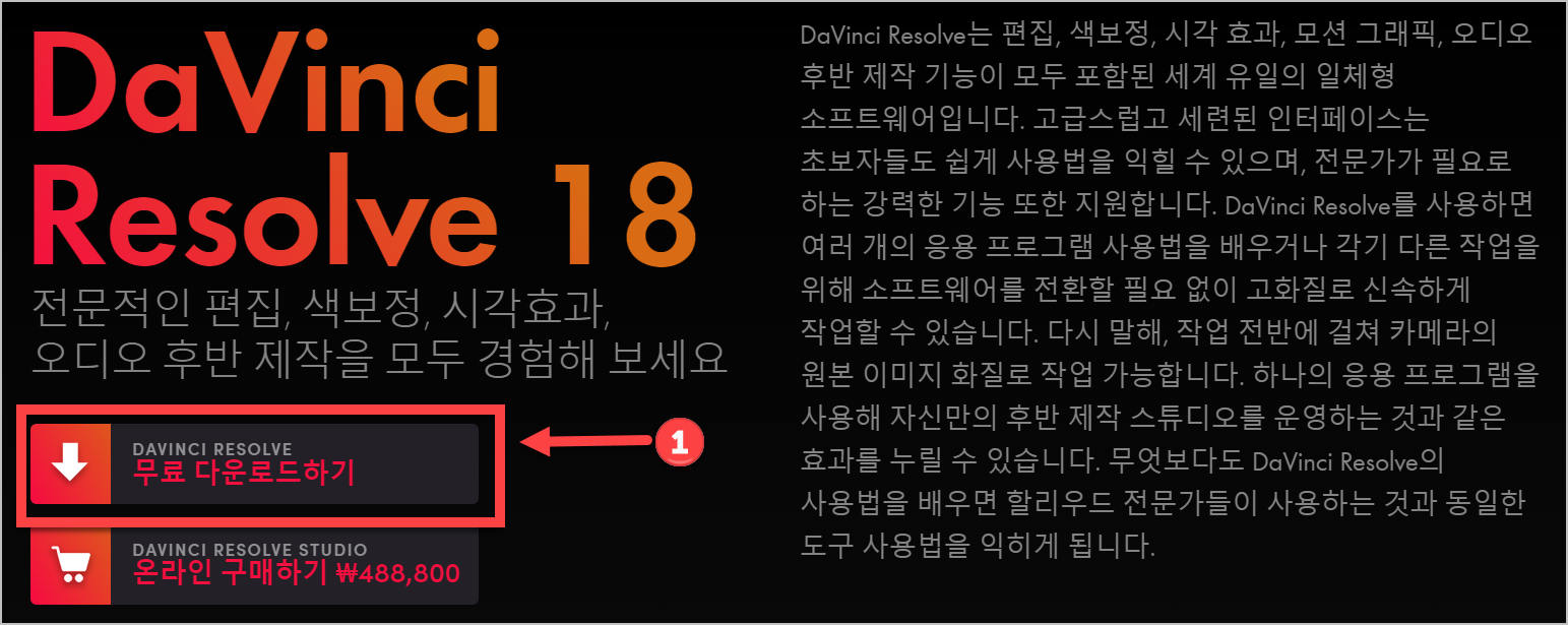 다빈치 리졸브는 편집, 색깔 바꾸기, 특수 효과 만들기, 움직이는 그림(모션 그래픽) 만들기, 그리고 소리 편집 같은 모든 기능을 한 프로그램에서 할 수 있는 유일한 소프트웨어입니다. 이 프로그램은 사용하기 쉬운 멋진 디자인을 가지고 있어서 영상 만들기를 처음 시작하는 사람들도 쉽게 배울 수 있고, 전문가들이 필요로 하는 강력한 기능도 제공합니다. 다빈치 리졸브를 사용하면 여러 개의 다른 프로그램을 배울 필요 없이, 하나의 프로그램에서 모든 작업을 빠르고 고화질로 할 수 있습니다. 즉, 영상을 만들 때 처음부터 끝까지 카메라로 찍은 원본 그대로의 화질로 작업할 수 있다는 뜻입니다. 이 프로그램 하나로 영상 편집 스튜디오를 운영하는 것처럼 다양한 작업을 할 수 있습니다. 게다가 다빈치 리졸브를 배우면 할리우드 전문가들이 사용하는 도구를 사용하는 방법도 배울 수 있습니다.