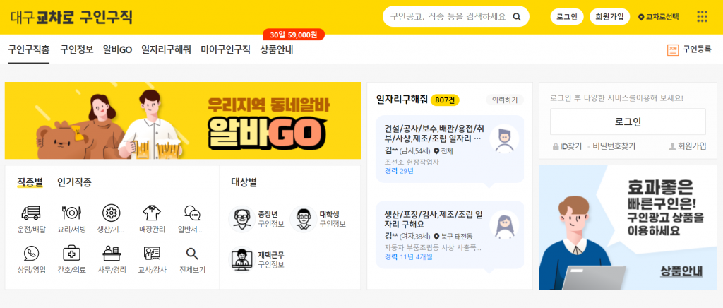 대형 취업 플랫폼을 제외하고, 지역에 따라 특화된 일자리 플랫폼이 다양하게 운영되고 있습니다. 그중 교차로 구인구직 사이트도 대전 지역을 대상으로 한 특별한 곳으로, 예전에는 동네 골목 어귀에 많이 보이던 종이로된 생활정보신문을 대체하여 이제는 일자리 정보를 제공하고 있습니다.