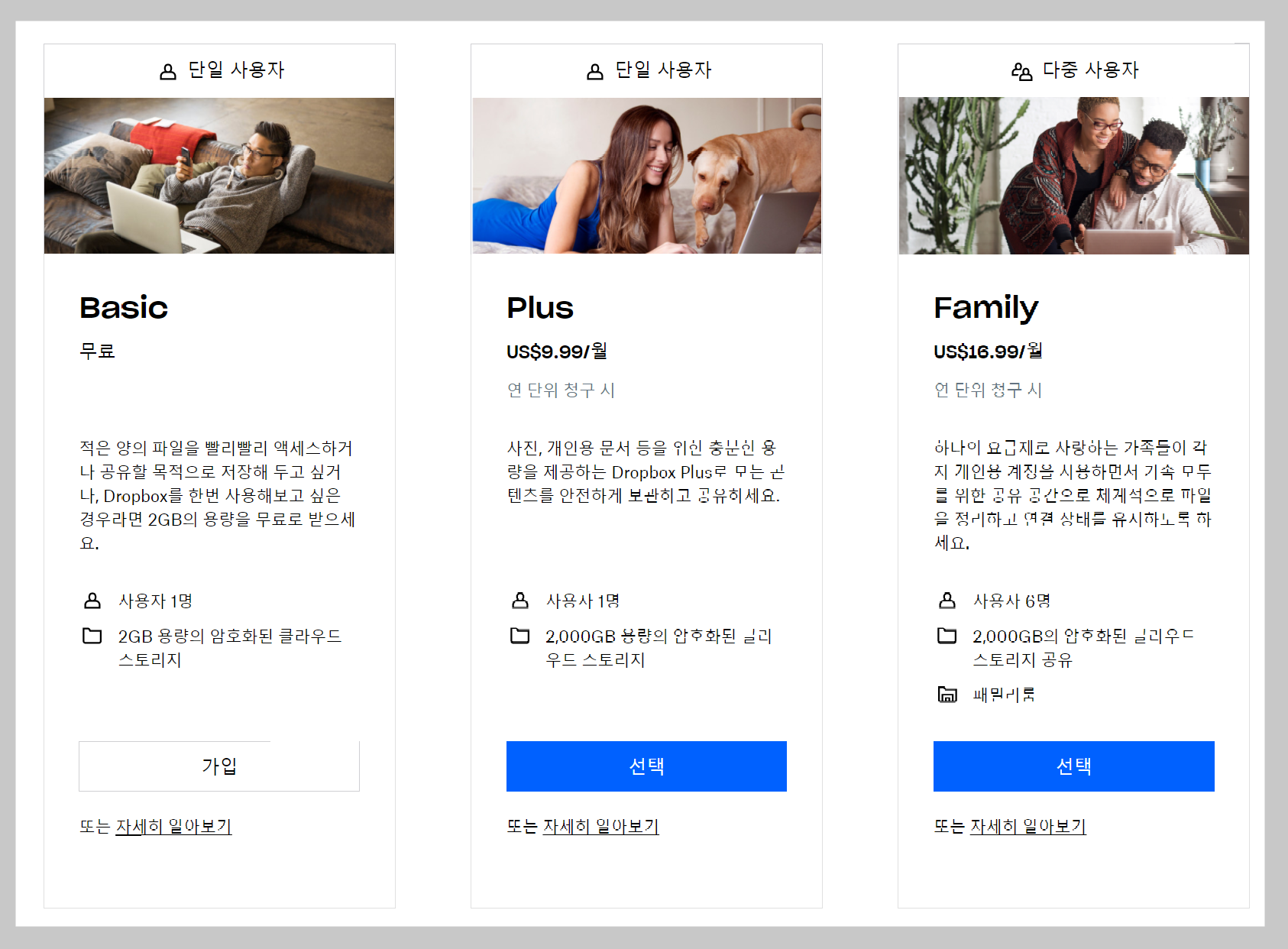 대부분의 사용자는 드롭박스 무료사용으로 충분합니다. 하지만 더 많은 스토리지 공간이 필요한 경우에는 유료 플랜을 구매하시는 것을 권해드립니다.