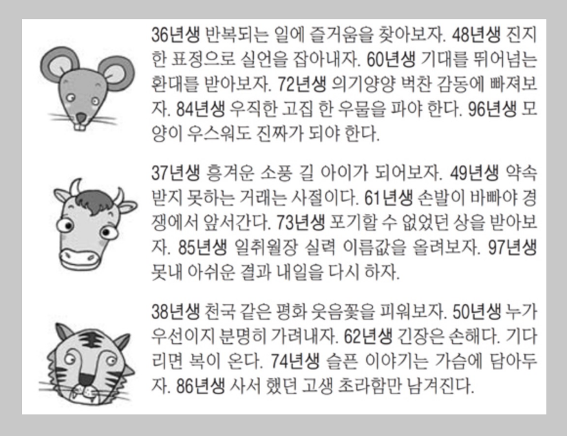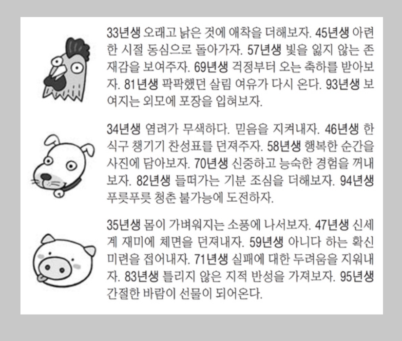 저도 오늘의 운세를 딱히 엄청나게 믿지는 않습니다. 하지만 오늘의 운세로 하루를 시작하여 오늘을 살아가는 기준으로 살아가면 왠지 행운이 찾아오는듯한 느낌입니다. 좋은 글귀는 취하고, 나쁜 글귀는 버리기도 합니다.