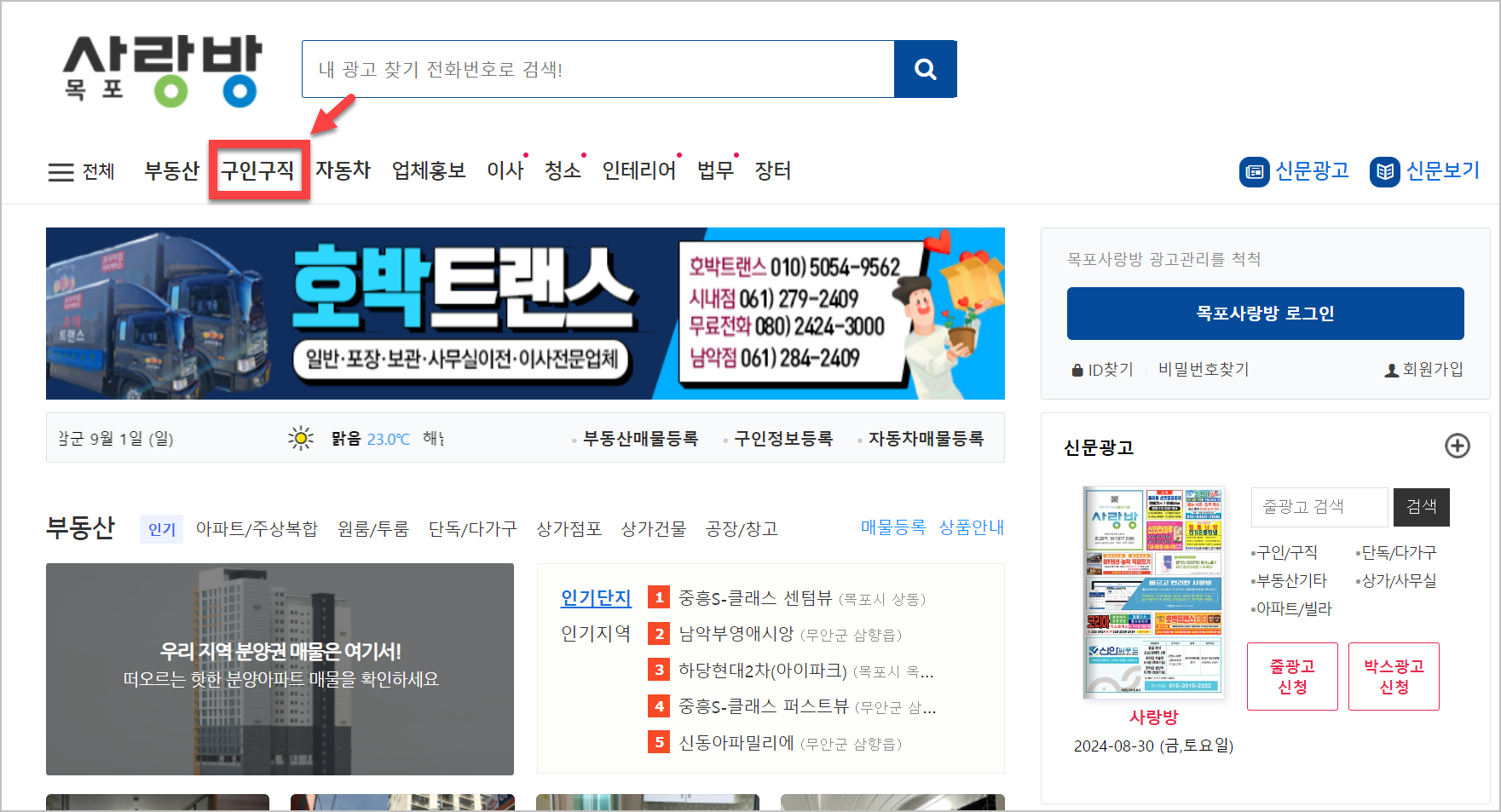여기에서 메뉴를 보면 부동산, 구인구직 등 여러가지것들이 있습니다. 여기에서 구인구직으로 들어가시면 여러가지 정보를 들어가시면 좋습니다.