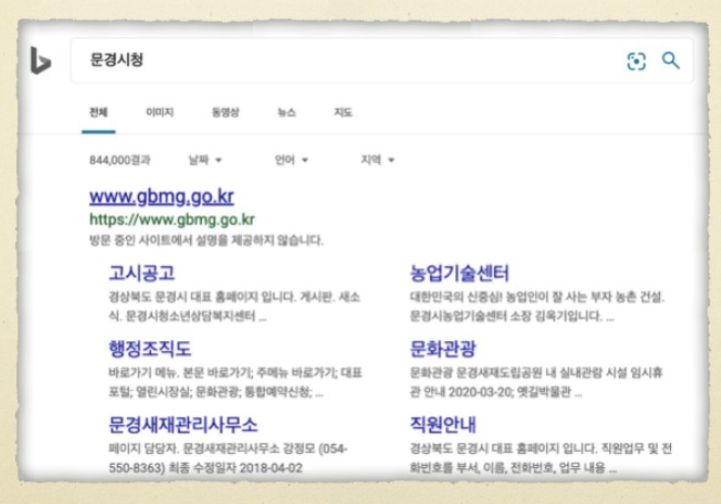 빙에서도 한번 '문경시청'이라고 검색을 해 봤습니다. 역시나 가장 맨 위에 나옵니다. 이것을 클릭하면 문경시청 홈페이지에 들어갈 수 있습니다.