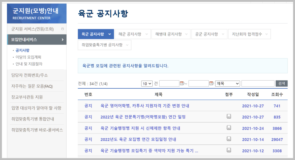 가장 일반적인 이유 중 하나는 육해공군 모집 일정을 확인하는 것입니다. 특히나 카투사, 영어어학병 등 특정 분야를 모집하는 경우에는 자격 기준과 모집 일정이 있기 때문에 홈페이지 방문을 통해 지속적으로 확인하는 것이 좋습니다.