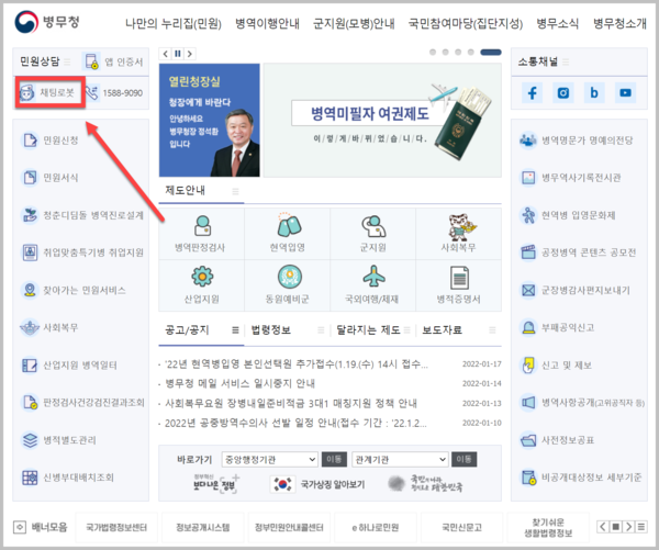 전화 외에도 인터넷, 문자 상담 등 다양한 방법을 통해 소통창구를 제공하고 있습니다. 또한, 공식홈페이지를 방문하면 왼쪽 상단에 '채팅 로봇' 옵션이 있습니다. 개인적으로 챗봇을 이용하는 것이 가장 편리하다고 생각하는 방법이기에 한번 소개해보도록 하겠습니다.
