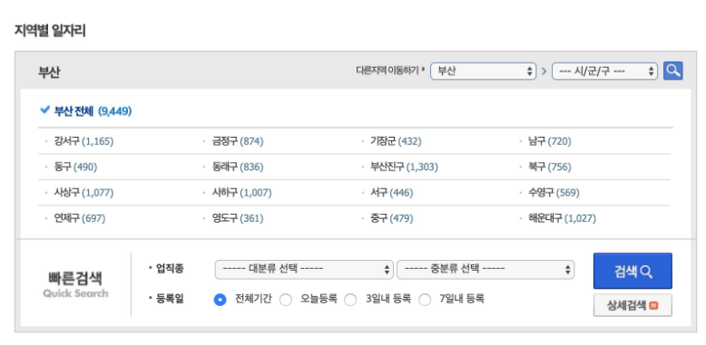 위의 링크를 통해 들어가면 해당 웹 홈페이지로 바로 접속할 수 있습니다. 모바일에서도 잘 만들어져 있어 사용에 문제가 없습니다. 지역별로 분류되며, 업직종별로도 구분되어 있습니다. 하지만 직접 키워드를 넣고 검색하는 기능은 지원하지 않아 아쉬운 점이 있습니다.