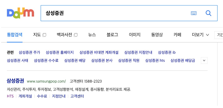 위 이미지는 삼성증권을 다음에서 검색한 결과입니다. 가장 맨위에 삼성증권 홈페이지가 나와 있음을 확인할 수 있습니다.
