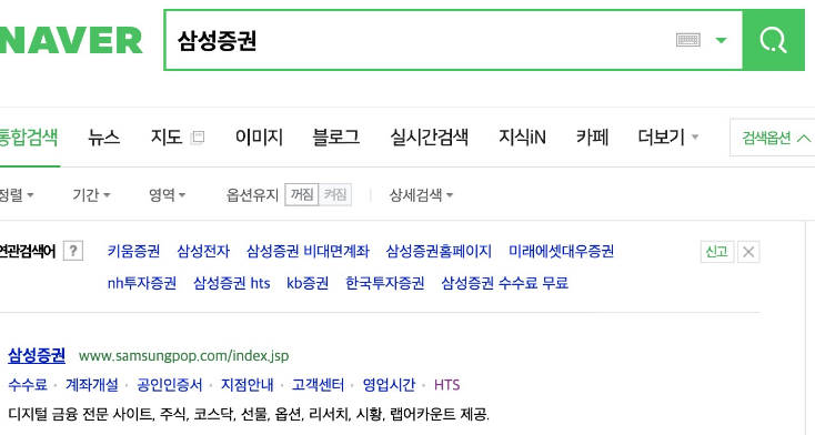 위에 올라와 있는 이미지는 네이버에서 검색 결과입니다. 가장 첫번째로 올라온 검색 결과가 삼성증권 홈페이지 입니다.