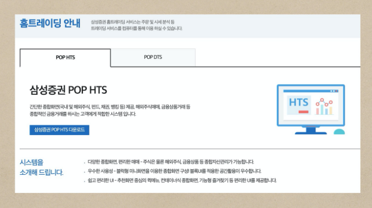 삼성증권 홈페이지에 들어가는 이유는 거의 대부분의 사람이 삼성증권에서 제공을 하고 있는 삼성증권 POP HTS 다운로드 하기 위함입니다. 이번 포스팅은 이것을 중심으로 설명을 해보려고 합니다.