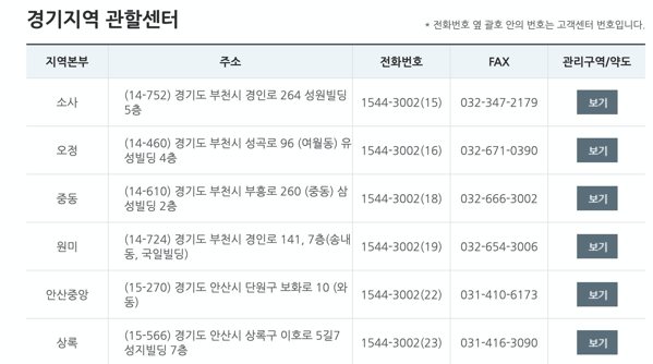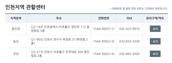 삼천리 도시가스는 여러 지역을 관할하고 있으며, 각 지역마다 연락처가 조금씩 다를 수 있습니다. 예를 들어 인천 지역의 관할센터는 위와 같습니다. 괄호 안의 숫자만을 주목하면 될 것 같습니다. 주소와 팩스, 관리구역이 나와있으니 확인하시길 바랍니다.