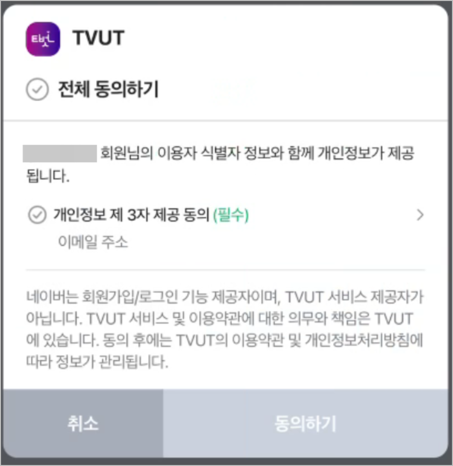 위 화면은 네이버를 통해 가입을 시도할 때 나타나는 동의 화면입니다. 네이버든 카카오든 화면 구성은 크게 다르지 않으며, 개인정보 제공에 대한 동의 과정을 포함하고 있습니다. 동의를 하지 않으면 가입을 진행할 수 없으며, 동의는 두 번 이루어집니다. 한 번은 네이버(또는 카카오)에, 또 한 번은 KBS에 개인정보를 제공하는 과정입니다. 이러한 단계를 완료한 후에야 본격적으로 정보를 입력하고 가입 절차를 마칠 수 있습니다.