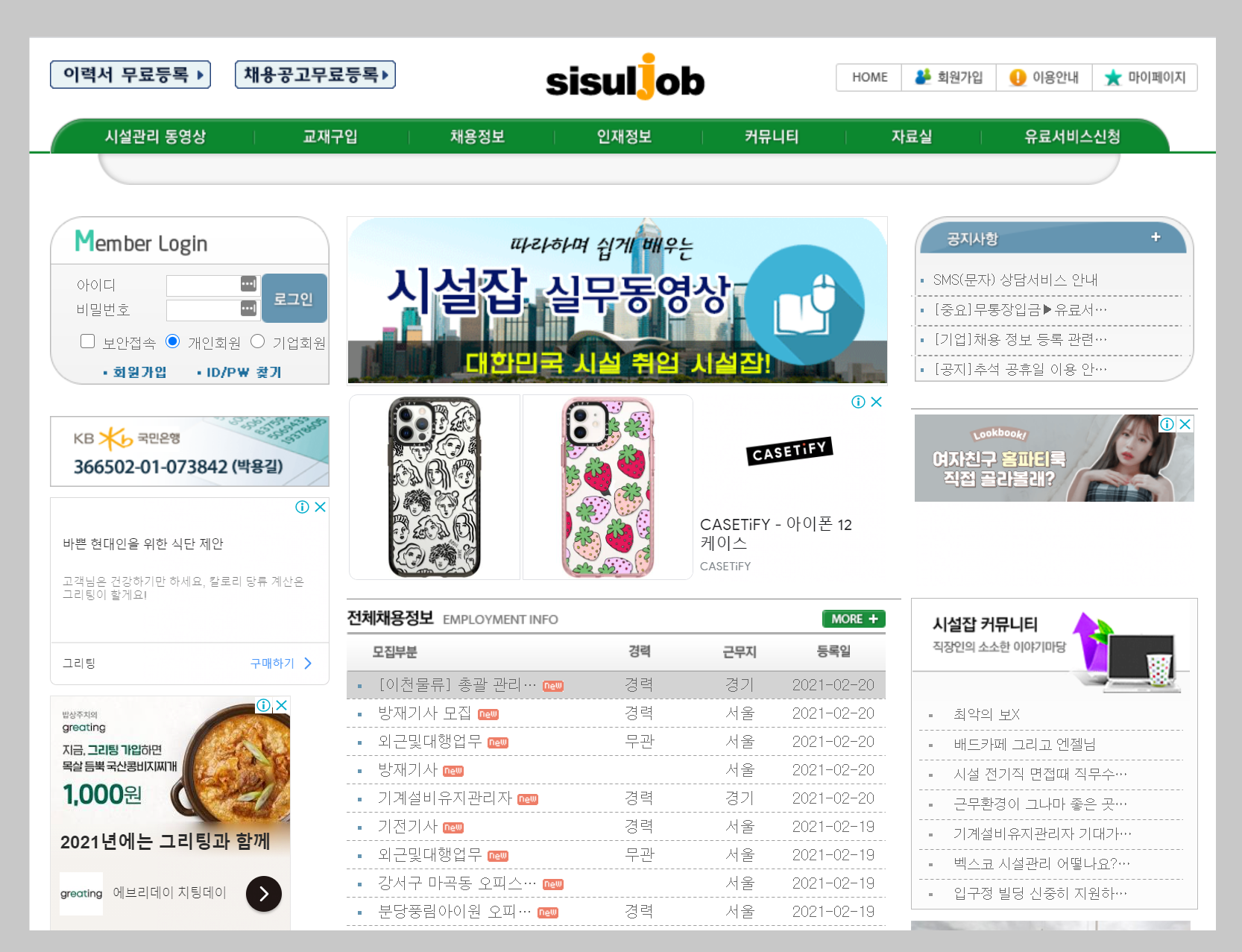시설잡 홈페이지에 들어가면 시설과 관련된 여러가지 정보를 얻을 수 있습니다. 가장 중요한 것은 채용정보이지만, 교재와 같은것, 그리고 관련동영상을 시설잡 사이트에서 확인이 가능합니다.