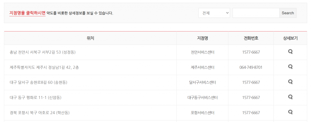 위 링크에서 각 지점의 위치와 연락처를 확인하실 수 있습니다. 모바일 사용자들이 많기 때문에 별도로 번호를 적어드리지 않겠습니다. 해당 사이트로 직접 접속하셔서 확인하시는 것이 편리할 듯 합니다. 본인의 위치 정보를 클릭하면 가까운 곳 확인할 수 있으며, 전화번호도 확인 가능합니다.