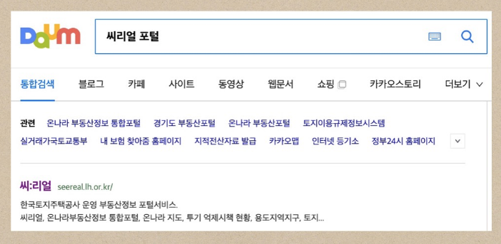 다음에서는 '씨리얼 부동산' 뿐만아니라 '씨리얼 포털'이라고 검색을 해도 들어갈 수 있습니다. 어떻게 들어가든 상관이 없습니다.