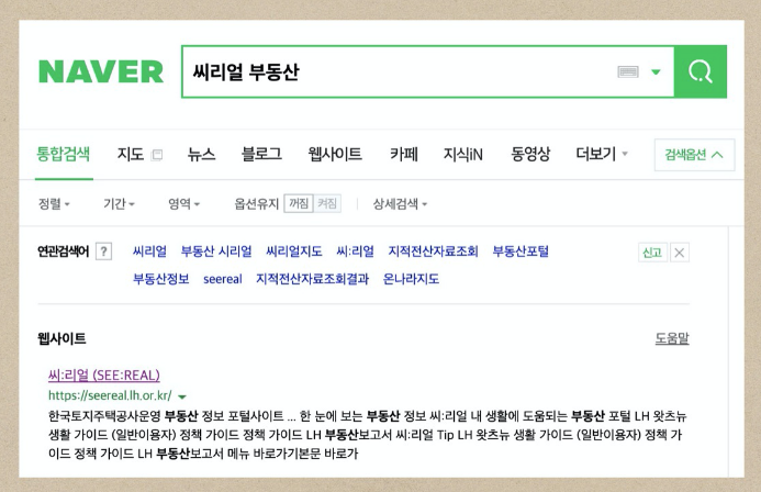 위 이미지를 보시면 알겠지만 씨리얼 부동산이라고 검색을 해야 네이버에서는 손쉽게 들어갈 수 있습니다.