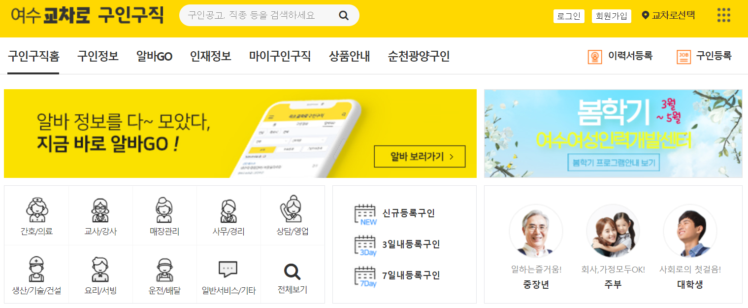구인구직사이트 역시 조금은 많이 바뀌었습니다. 과거에는 교차로 잡이라는 사이트의 하부 도메인으로 이루어졌지만, 이제는 여수교차로 자체 호스팅으로 바뀐것 같은 느낌입니다.
