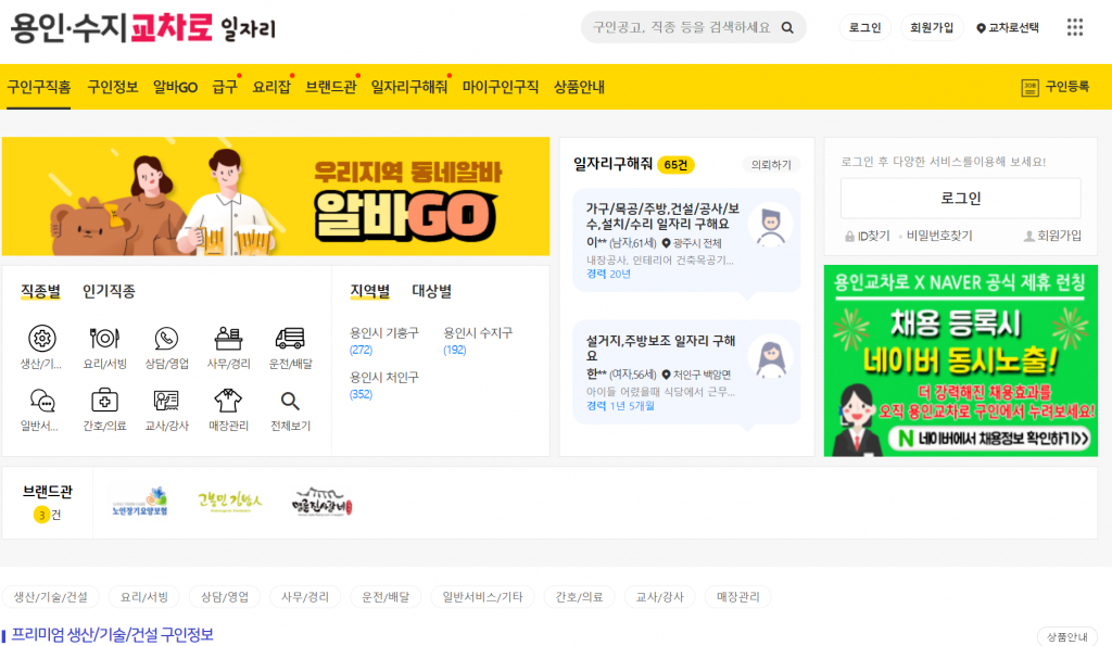 가장 상단에 뜨는 결과를 클릭하면 위와 같은 화면이 나오게 됩니다. 이렇게 접속했다면 용인 교차로에 맞게 접속한 것입니다. 여기에서 구인구직을 클릭하면 일자리 페이지로 바로 이동할 수 있습니다.