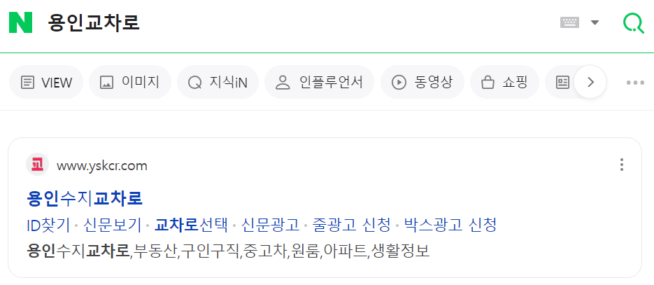 용인교차로 구인구직 사이트에 접속하려면 위 사진에서 보이는 것 처럼, 네이버와 다음과 같은 대형 포털 사이트에서 검색해야 합니다. 포털에서 검색하면 위와 같은 화면을 볼 수 있습니다. 여기에서 가장 상단에 뜨는 결과인 "용인 수지 교차로"라는 결과를 찾을 수 있습니다. 아무래도 수지, 기흥, 처인이 모두 포함되어서 이렇게 이름이 지어진 것 같습니다.