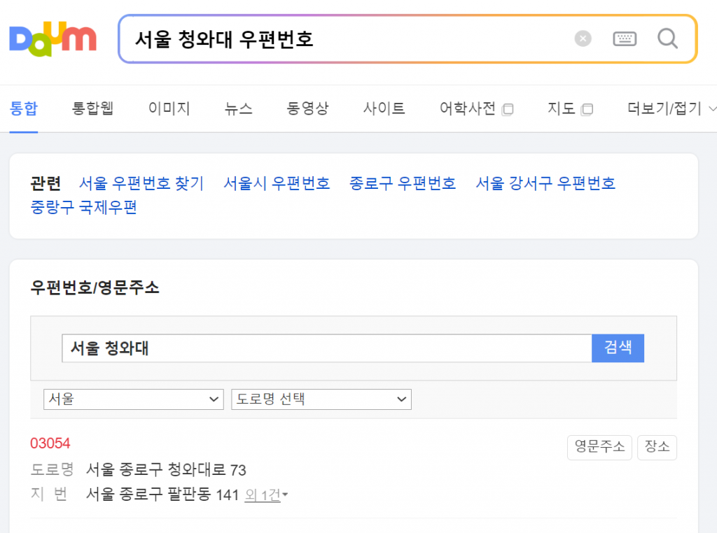 두 번째 방법은 다음이나 네이버와 같은 포털사이트를 활용하는 것입니다. 다음에서 '서울 청와대 우편번호'와 같이 검색하면 위와같은 결과를 얻을 수 있습니다. 마찬가지로 원하는 곳의 주소를 입력하면 원하는 내용을 얻을 수 있습니다. 물론 네이버에서도 이런 기능이 있지만, 경험상 다음에서 검색이 더 편하기 때문에 이렇게 소개합니다.