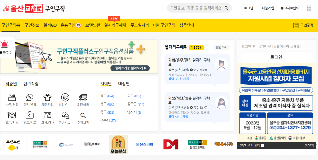 울산교차로 홈페이지에 접속하면 위와같은 모습을 볼 수 있습니다. 여기에서 부동산, 구인구직, 자동차 카테고리가 보입니다. 그 중에서도 가장 많은 사람들이 찾아보는 것은 '구인구직' 서비스입니다. 아래 링크를 통해 바로 이동할 수 있습니다.