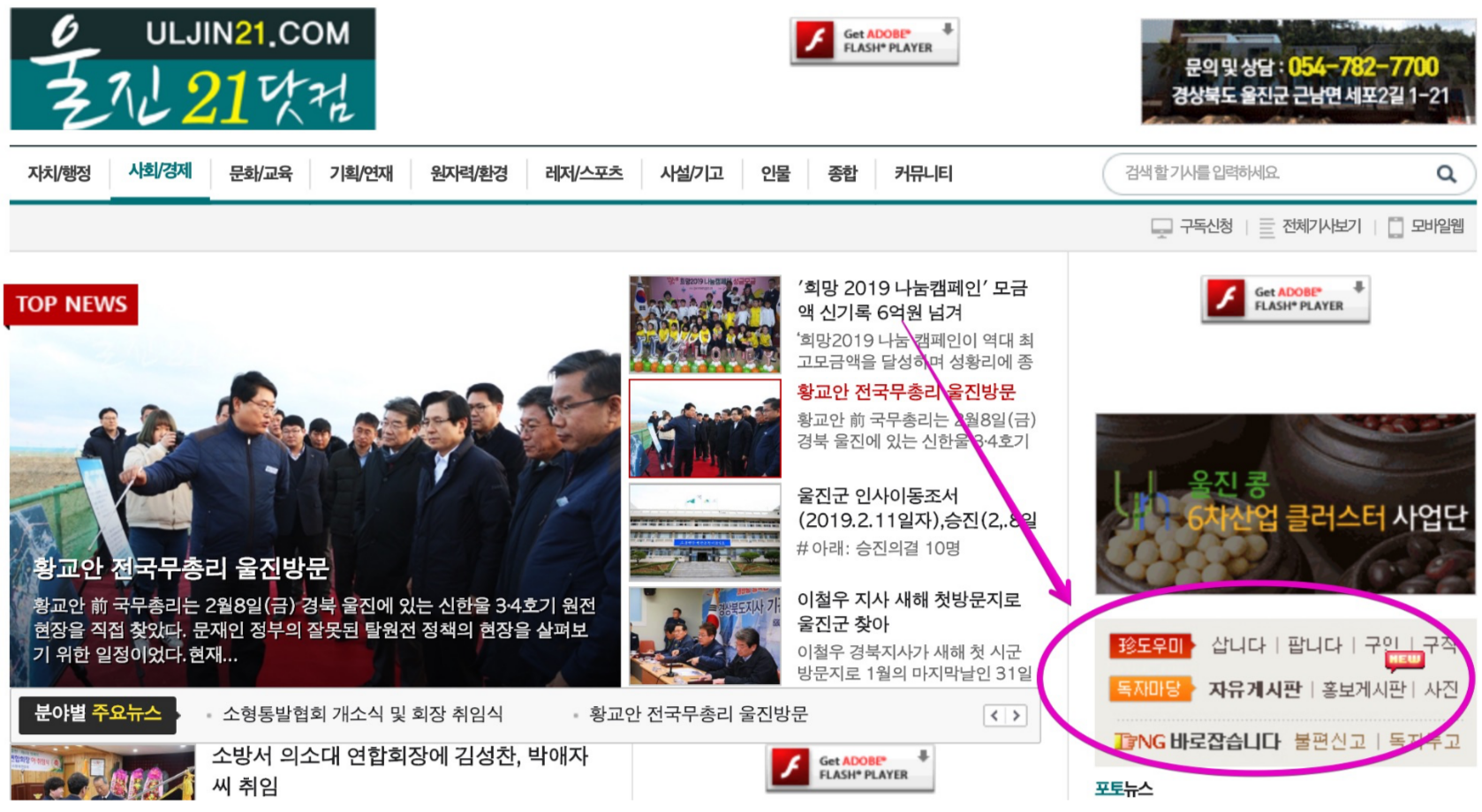 울진21닷컴에 처음들어가면 위와 같은 화면을 볼 수 있습니다.