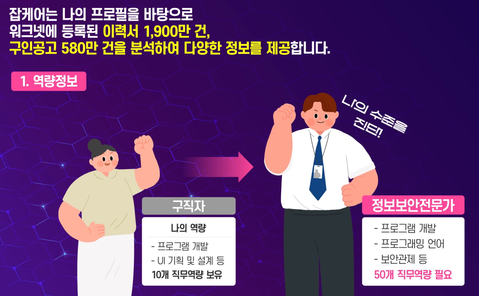 워크넷 잡케어는 사용자의 경력 개발 단계에 맞춰 직업 심리검사, 경력개발 경로, 시장 정보 등 다양한 맞춤형 서비스를 제공합니다. 이를 통해 구직자는 자신이 위치한 단계를 파악하고, 필요한 역량을 강화하며, 임금 수준과 취업 시장의 동향까지 알 수 있습니다. 또한, 잡케어는 향후 데이터를 지속적으로 보강하고, 직무 온톨로지를 고도화하여 다양한 고객층에게 더욱 정교한 맞춤식 직업 선택, 역량 개발 및 취업 준비 지원을 할 계획입니다.
