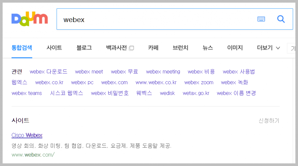 공식 홈페이지로 이동하려면 검색 엔진에서 '웨브엑스(Webex) 다운로드'를 검색하면 공식 홈페이지 링크를 찾을 수 있습니다. 가장 상단에 뜨는 결과를 클릭하면 됩니다.