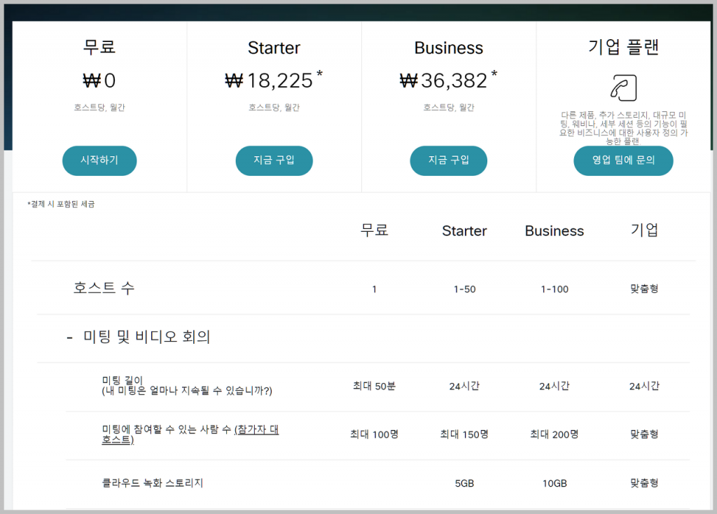 월간 구독 요금은 다양하며, 미팅을 자주하는 기업에게는 큰 부담이 되지 않을 것입니다. 가장 큰 차이점은 시간의 제한입니다. 유료 버전은 최대 24시간 동안 회의를 진행할 수 있지만, 24시간 동안 진행하는 경우는 드물 것으로 생각됩니다.
