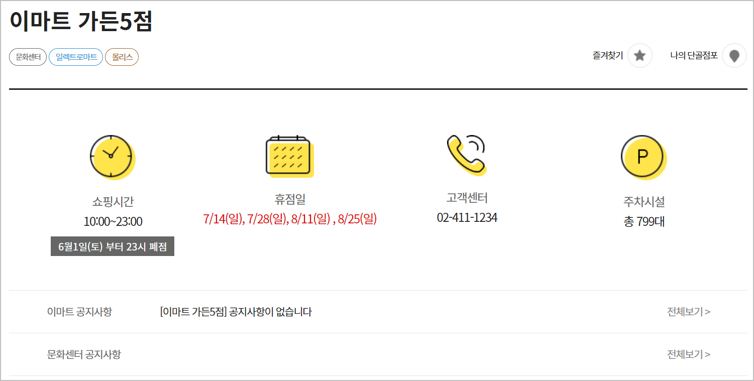 예를들어 가든파이브점의 경우에는 전화번호가 02-411-1234라고 되어 있네요. 여기로 연락을 하시면 됩니다. 이곳에는 또다른 정보들을 얻을수 있습니다. 휴점일과 쇼핑시간 등 이런 중요한 정보를 제공하고 있습니다.