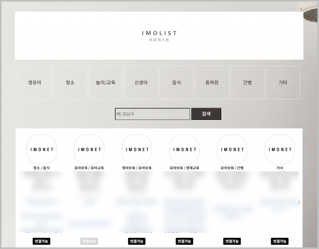 의뢰인 입장에서 Imo List에 들어가면 연결이 가능하며, 간단한 프로필과 지역, 현재 연결 가능 여부를 판단할 수 있습니다. 대부분 40~60대 여성분들이 많으신 것 같습니다. 또한, 의뢰인으로 가입할 수도 있고 도우미로 가입할 수도 있어 구인구직 사이트로서의 역할을 잘하고 있습니다.