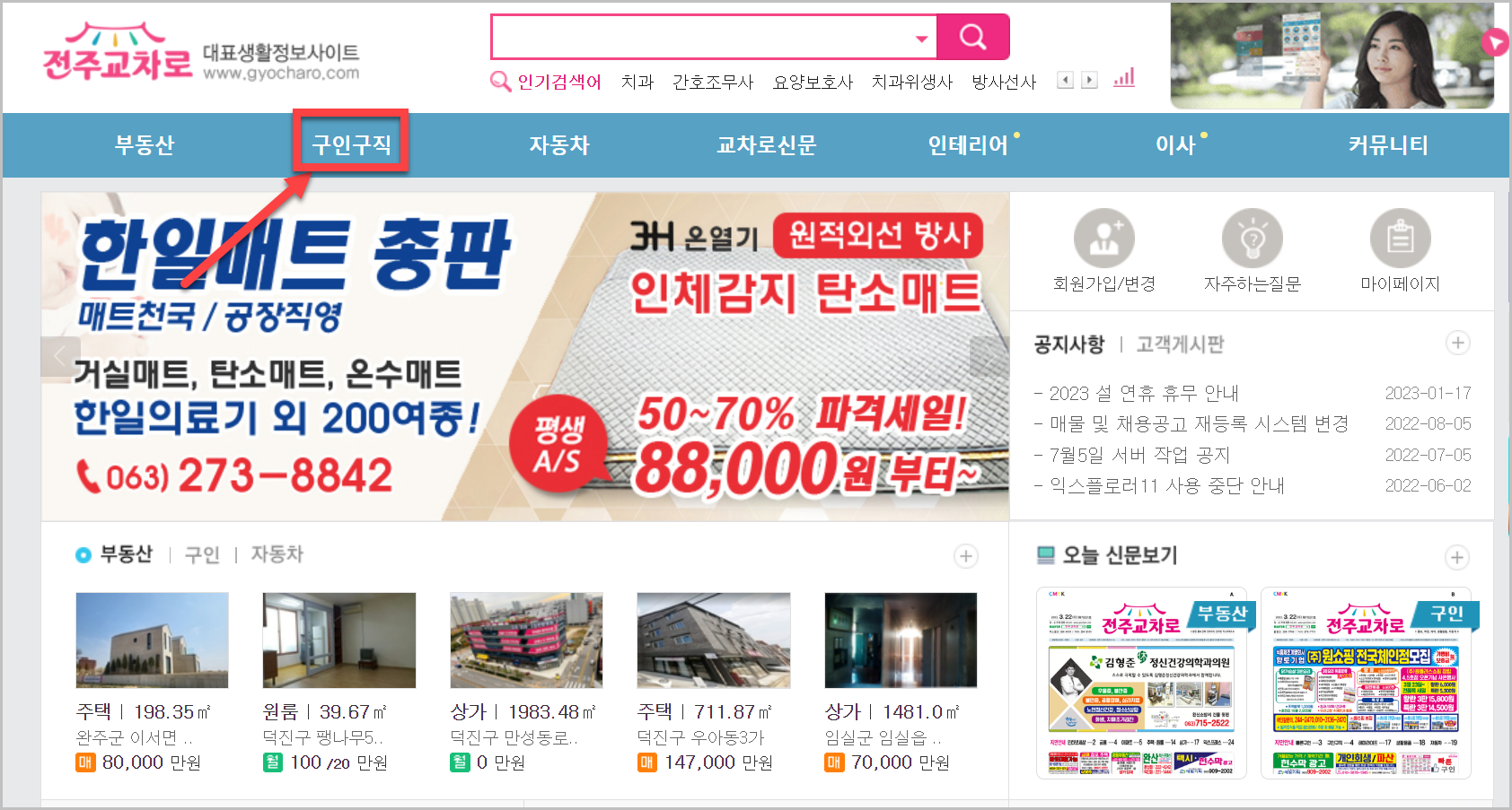 위와 같은 화면이 나오게 됩니다. 이곳에서 전주교차로구인구직 정보를 보기위헤서는 메뉴에 있는 구인구직을 클릭을 하시면 됩니다. 이곳에는 다양한 내용의 일자리 정보가 나와 있습니다.